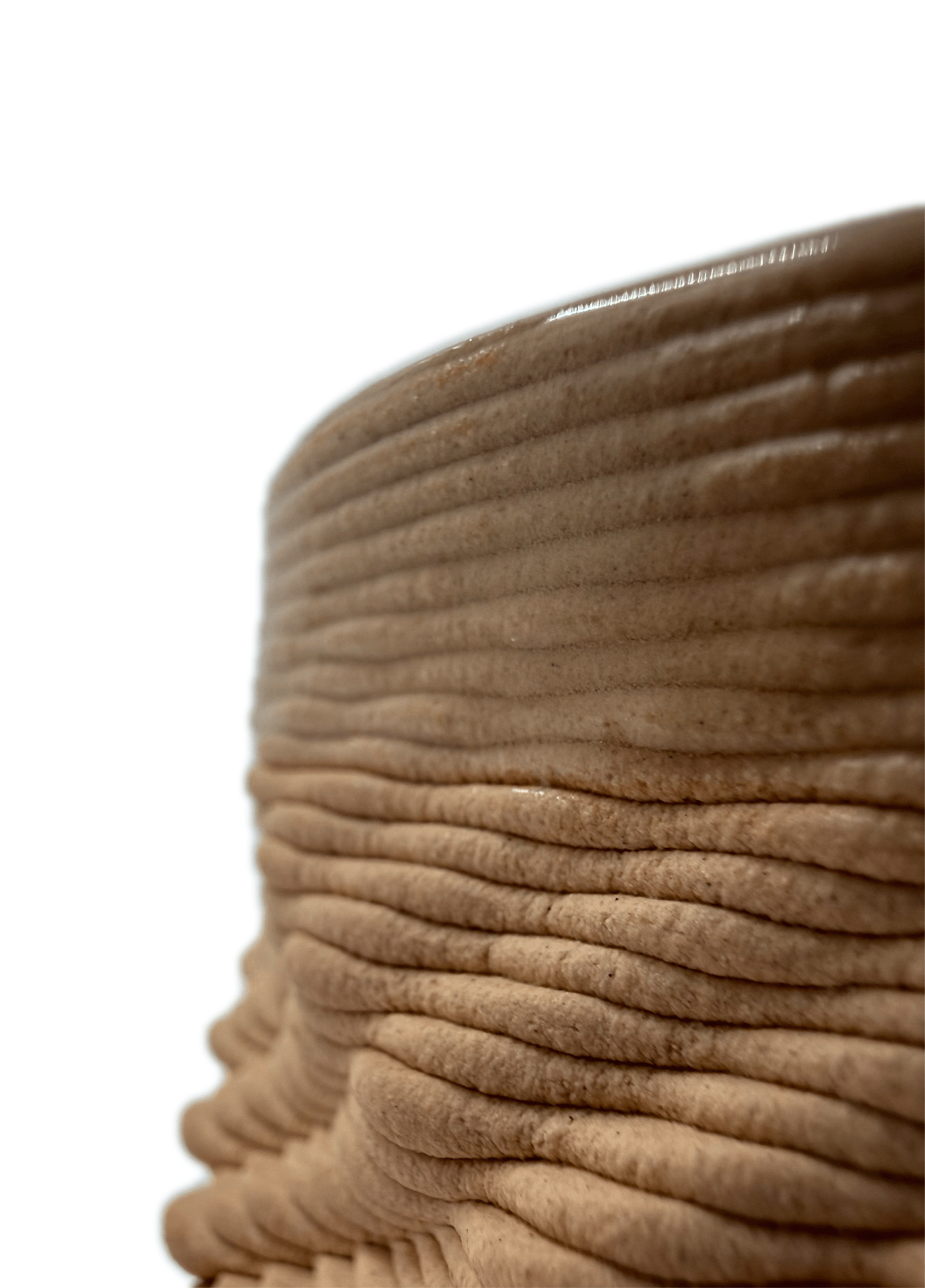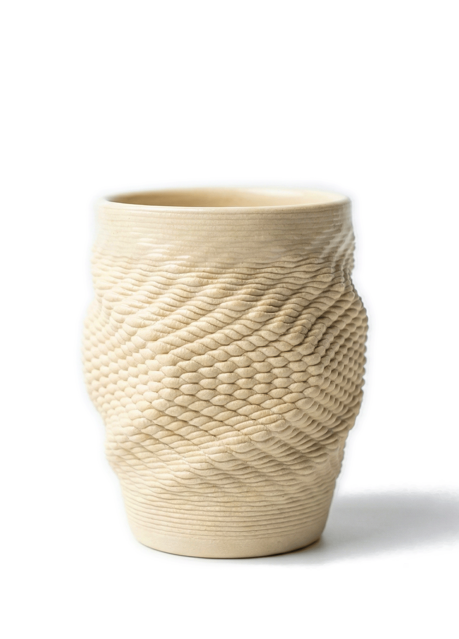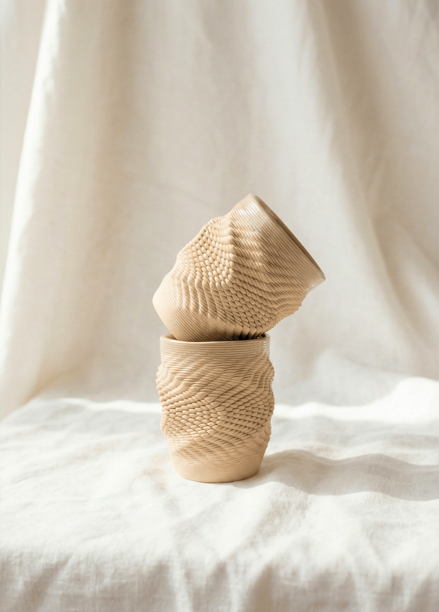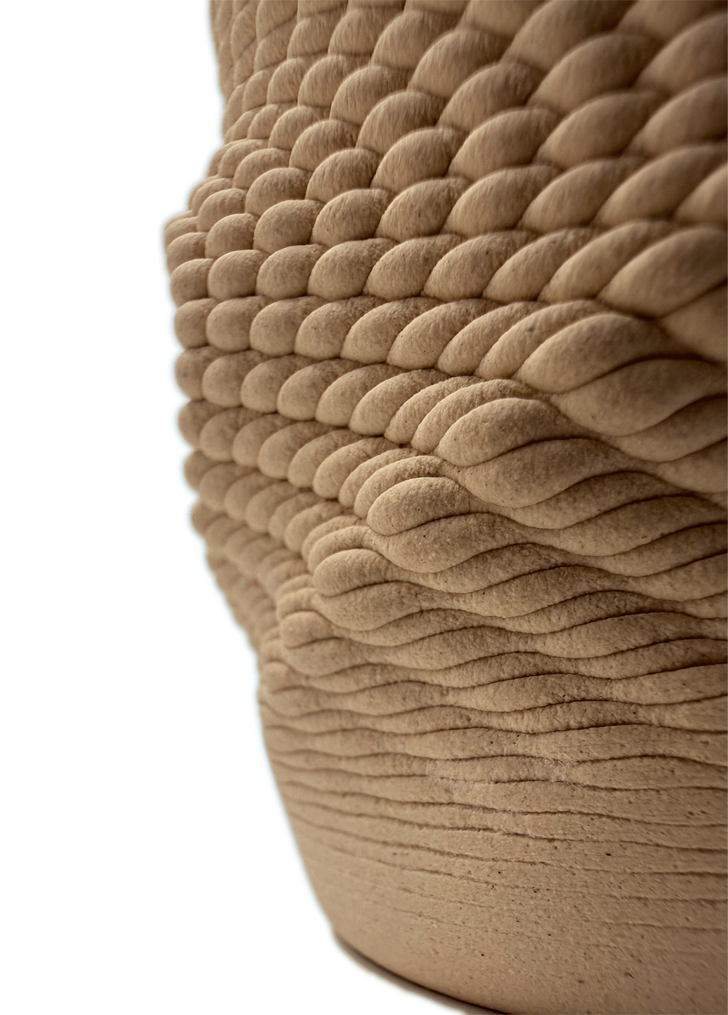 Yazıcının nozülünün mikro iç–dış atımları kil yüzeyde binlerce çentik bırakıyor; aynı siluette her parça kendine özgü bir ritim ve dramatik gölge oyunu sunuyor