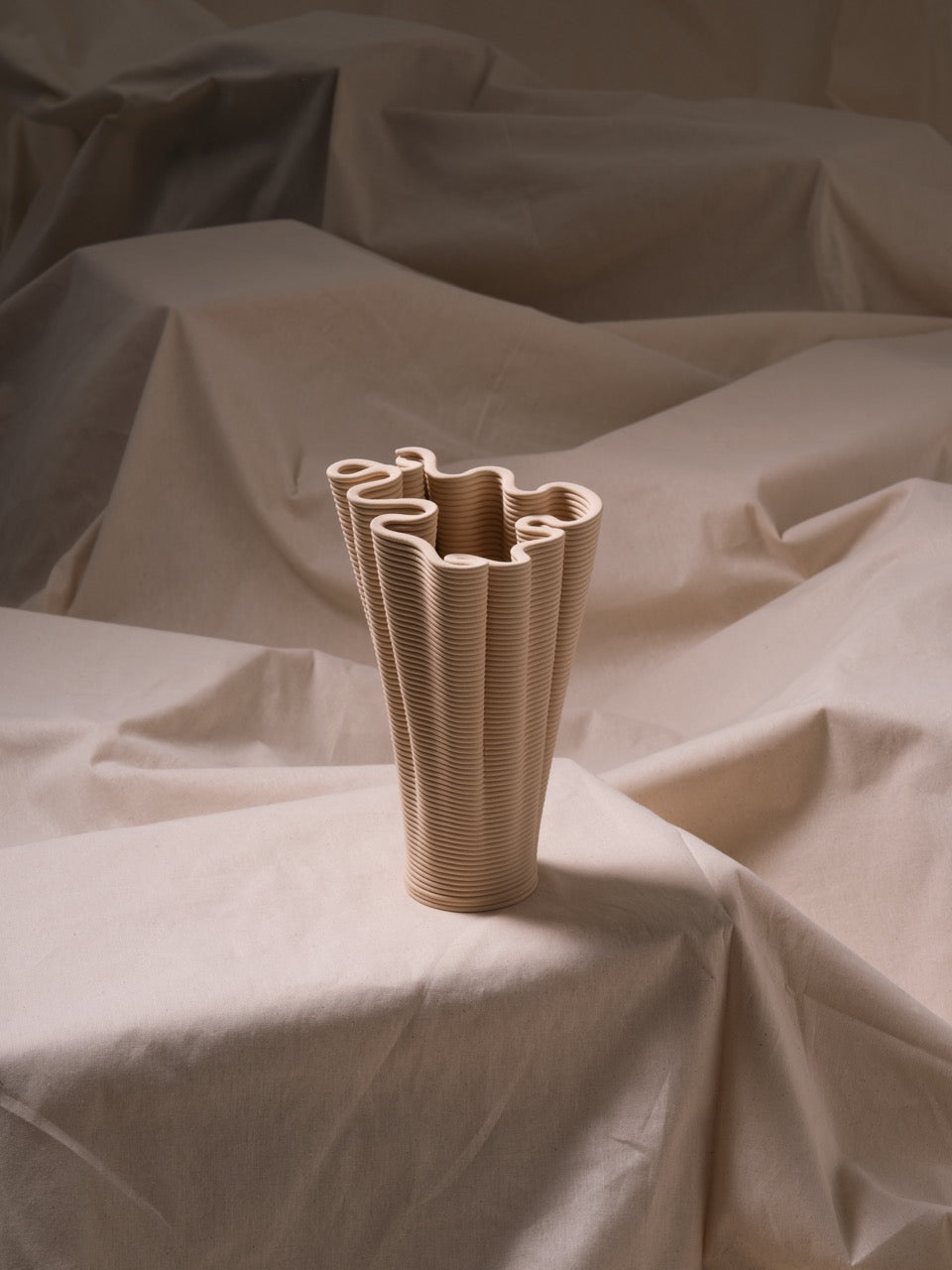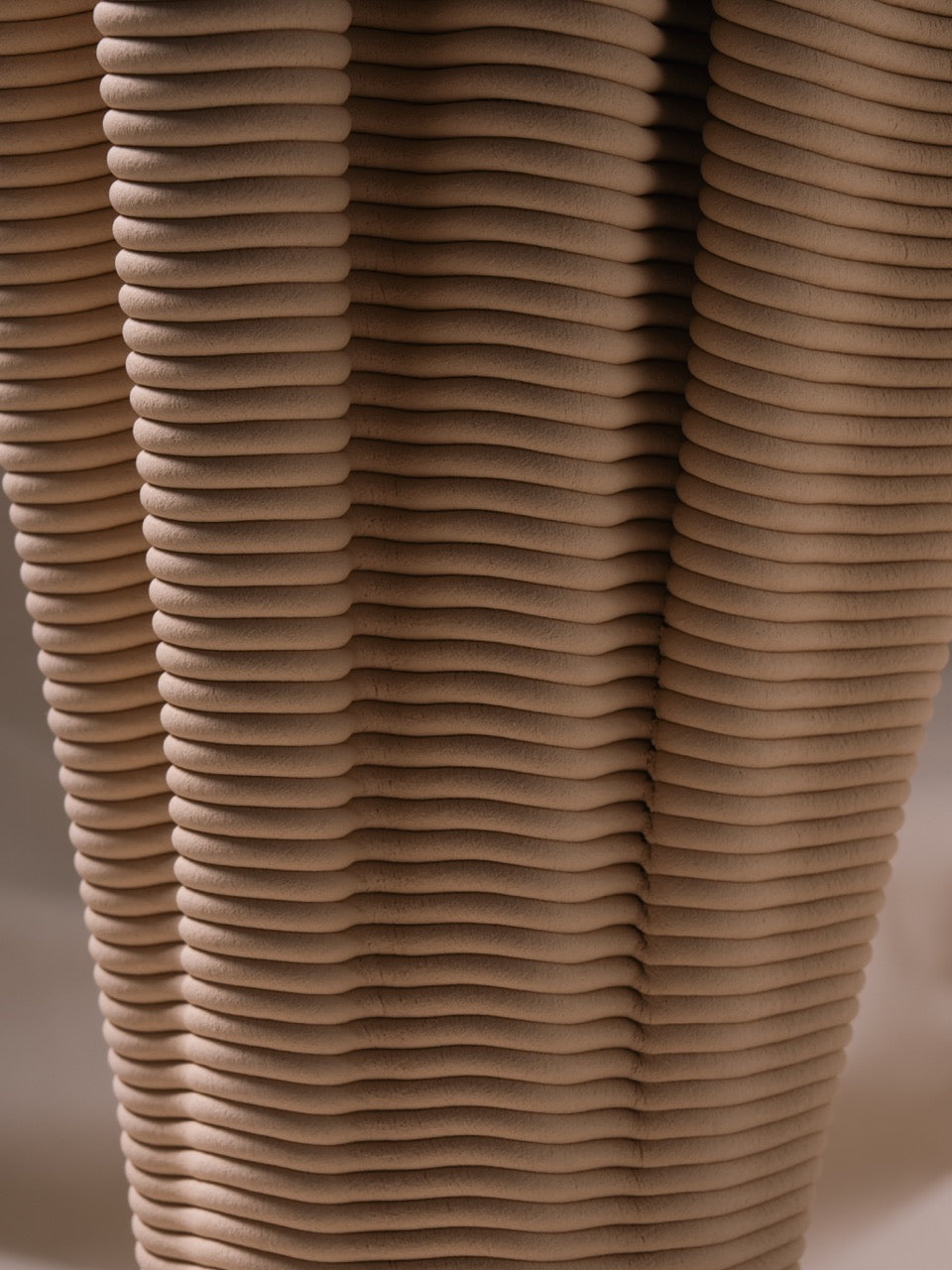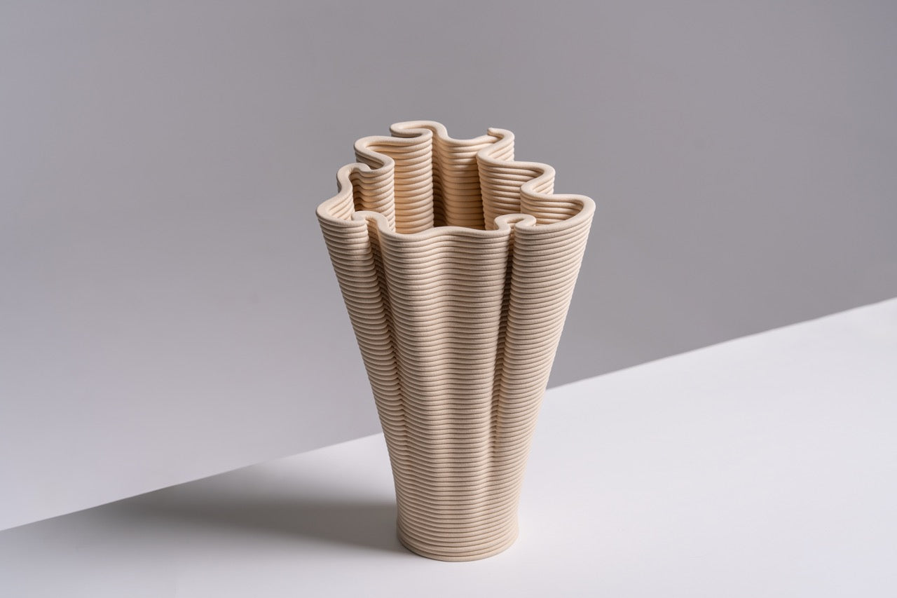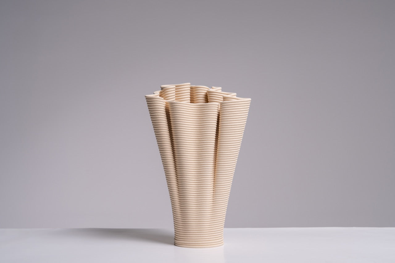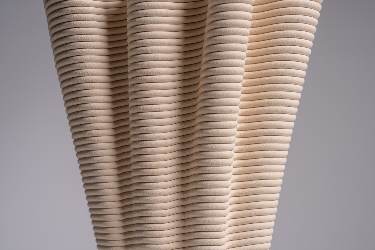 Coirra, dijital sarmal üretim tekniği ile mercanların doğal oluşum sürecinin kesişim noktasını araştırır. Her parça, mercanların kendi iskeletlerini yavaş bir birikimle inşa etmesine benzer şekilde, katman katman büyüyerek buruşuk bir form oluşturur. Kalın, sarmal yollar yüzeyde belirgin biçimde kalır ve üretim sürecinin izlerini taşır. Bazı yerlerde baskı yolları bilerek “kusurlu” tasarlanır; bu da sarmal dokuyu daha da belirginleştirir ve parçaların el yapımı tekniğe benzer bir şekilde inşa edildiğini vurgular.