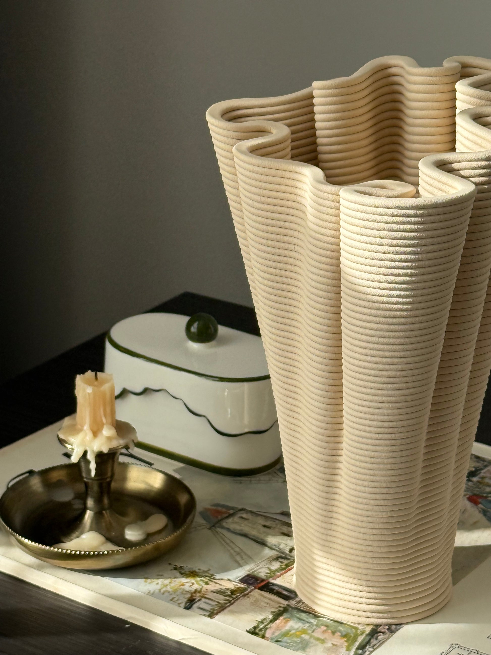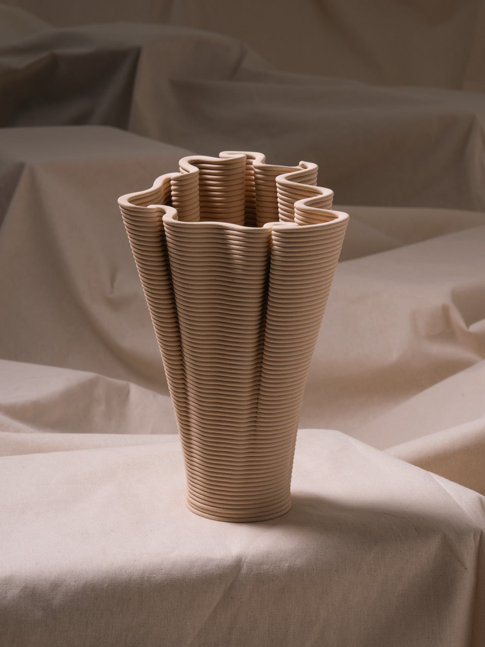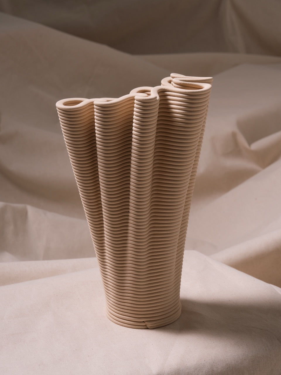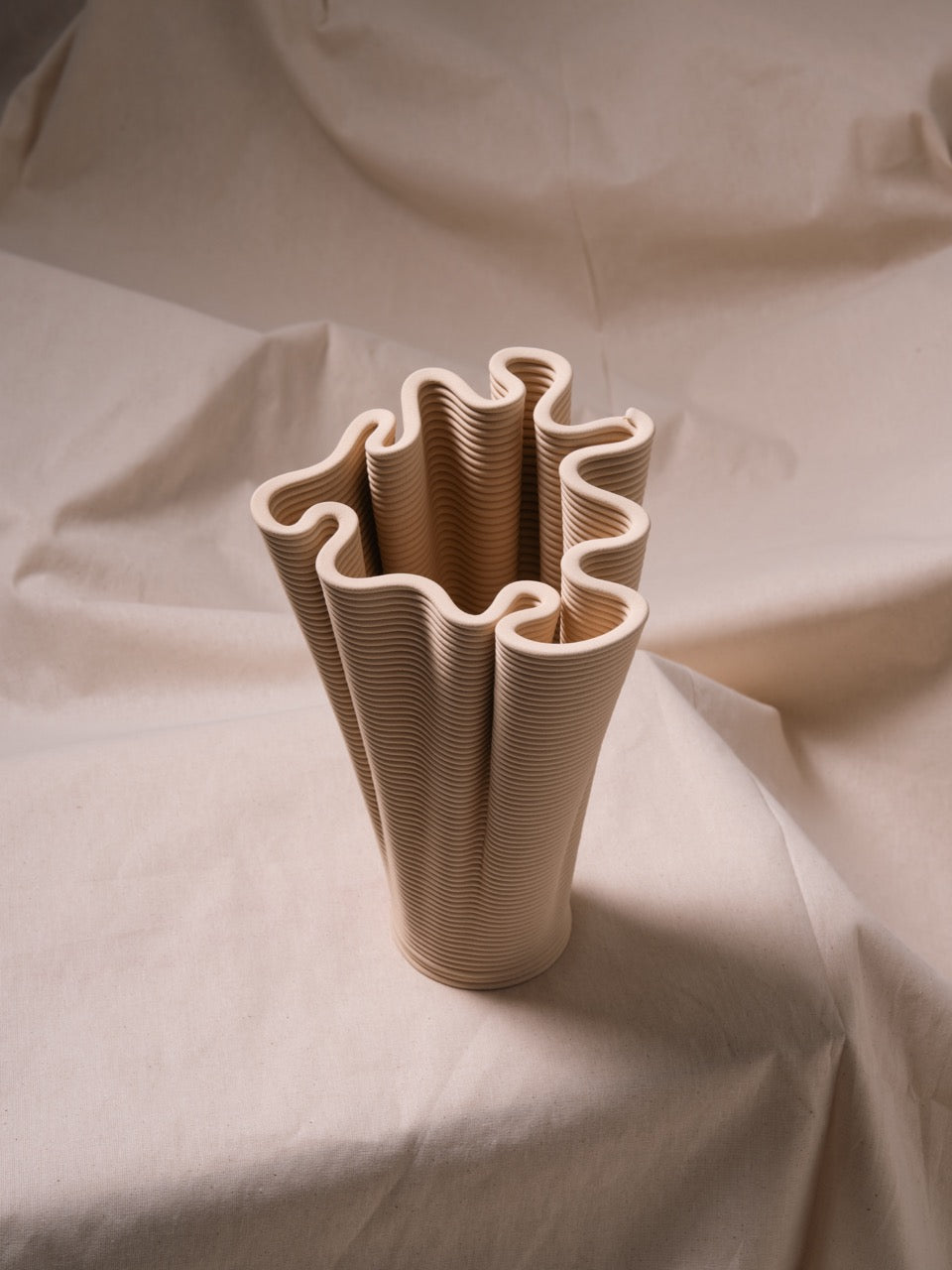 Coirra, dijital sarmal üretim tekniği ile mercanların doğal oluşum sürecinin kesişim noktasını araştırır. Her parça, mercanların kendi iskeletlerini yavaş bir birikimle inşa etmesine benzer şekilde, katman katman büyüyerek buruşuk bir form oluşturur. Kalın, sarmal yollar yüzeyde belirgin biçimde kalır ve üretim sürecinin izlerini taşır. Bazı yerlerde baskı yolları bilerek “kusurlu” tasarlanır; bu da sarmal dokuyu daha da belirginleştirir ve parçaların el yapımı tekniğe benzer bir şekilde inşa edildiğini vurgular.
