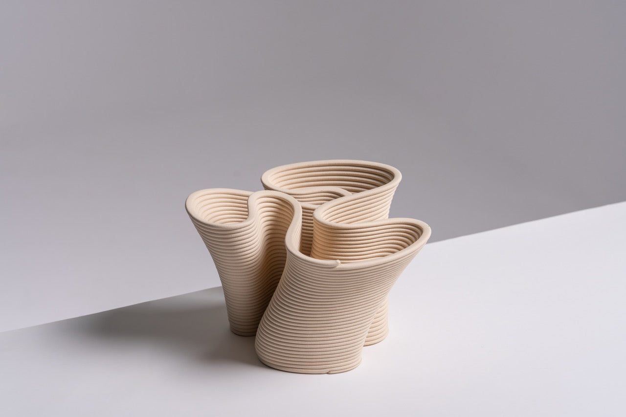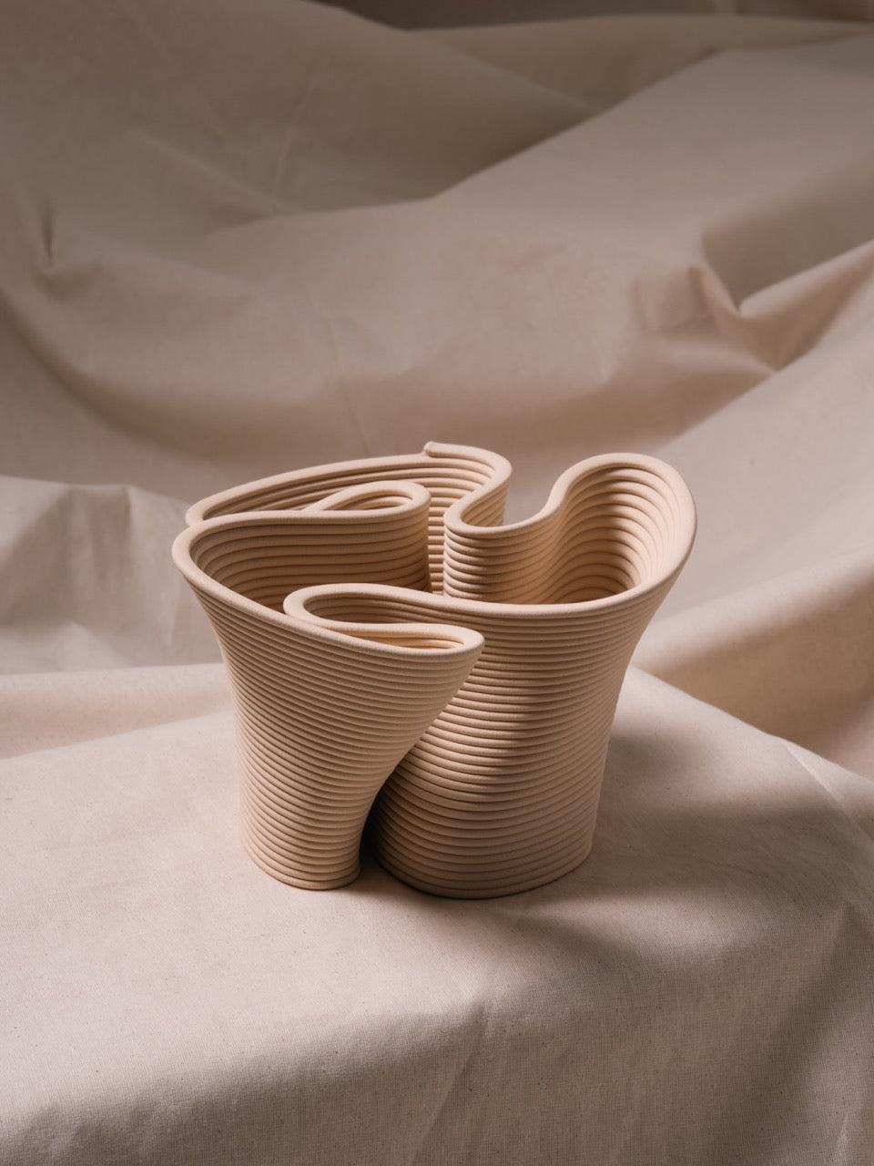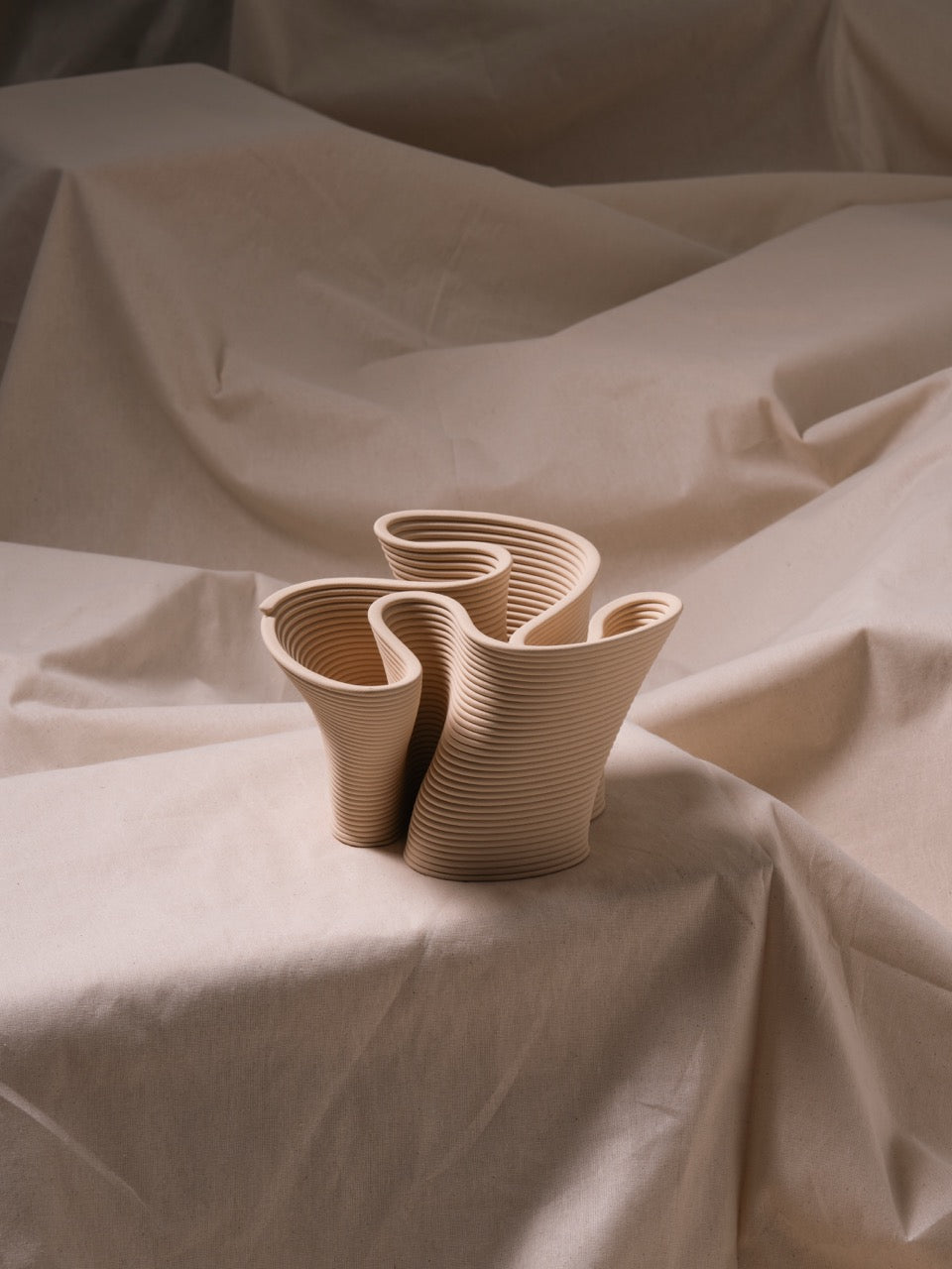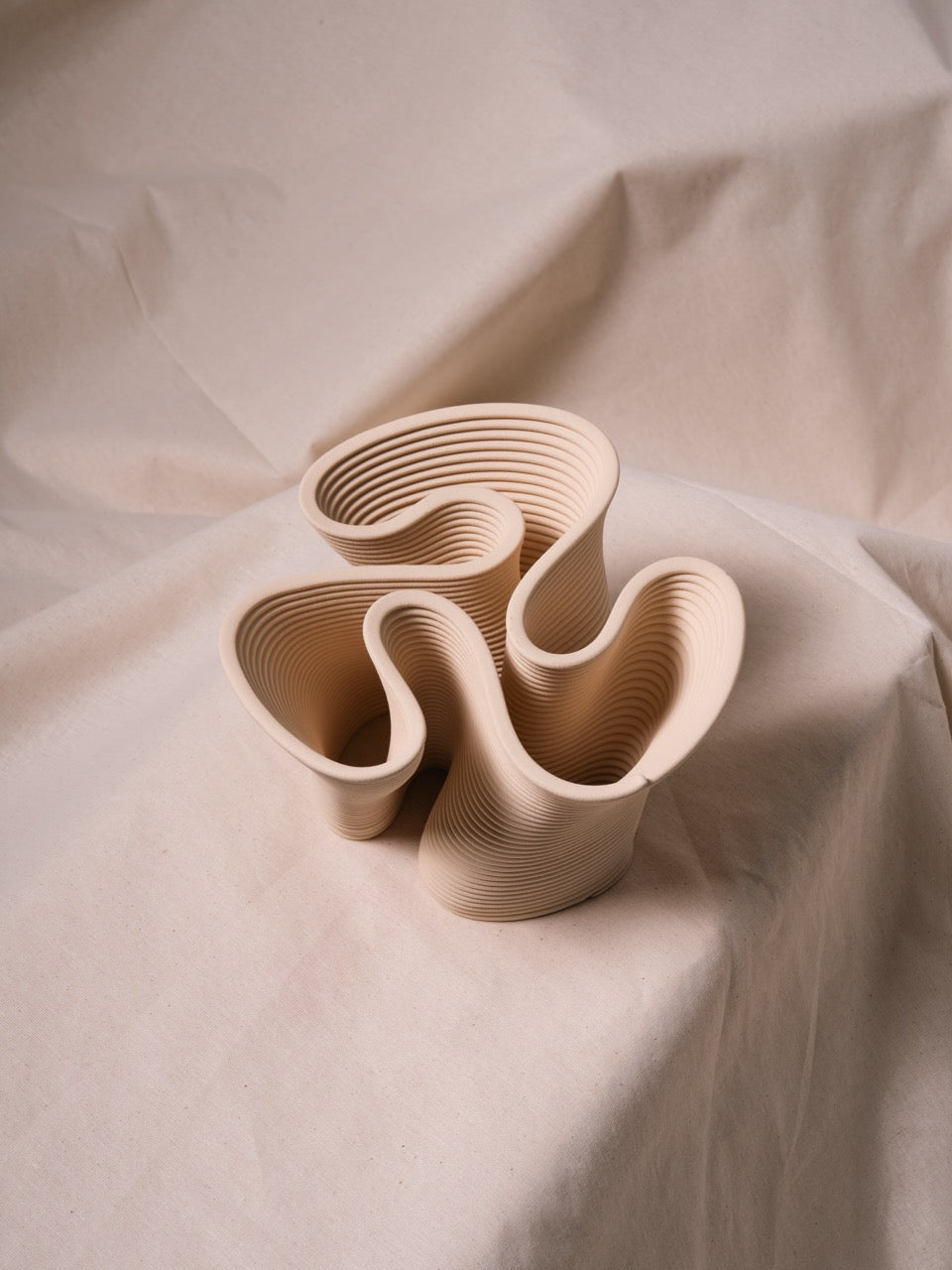Coirra, dijital sarmal üretim tekniği ile mercanların doğal oluşum sürecinin kesişim noktasını araştırır. Her parça, mercanların kendi iskeletlerini yavaş bir birikimle inşa etmesine benzer şekilde, katman katman büyüyerek buruşuk bir form oluşturur. Kalın, sarmal yollar yüzeyde belirgin biçimde kalır ve üretim sürecinin izlerini taşır. Bazı yerlerde baskı yolları bilerek “kusurlu” tasarlanır; bu da sarmal dokuyu daha da belirginleştirir ve parçaların el yapımı tekniğe benzer bir şekilde inşa edildiğini vurgular.