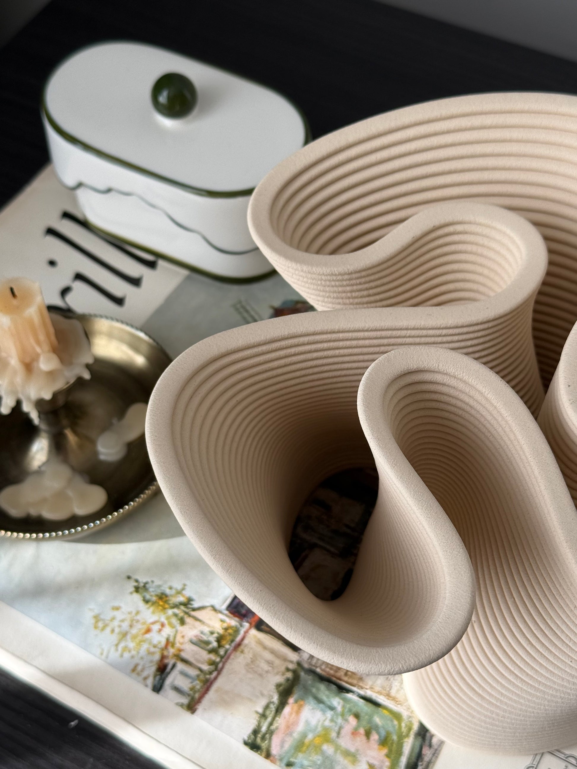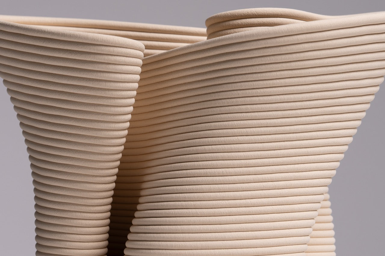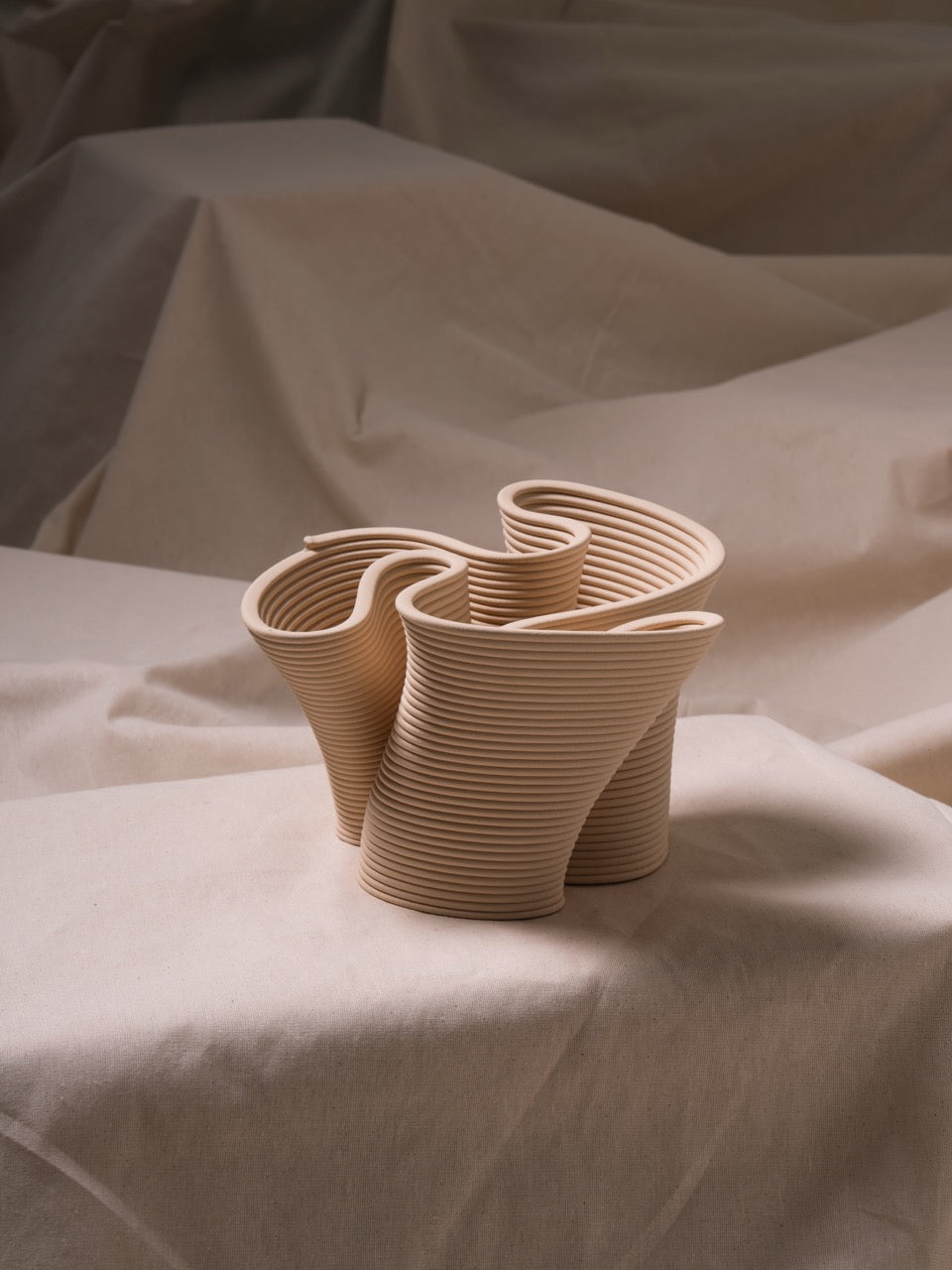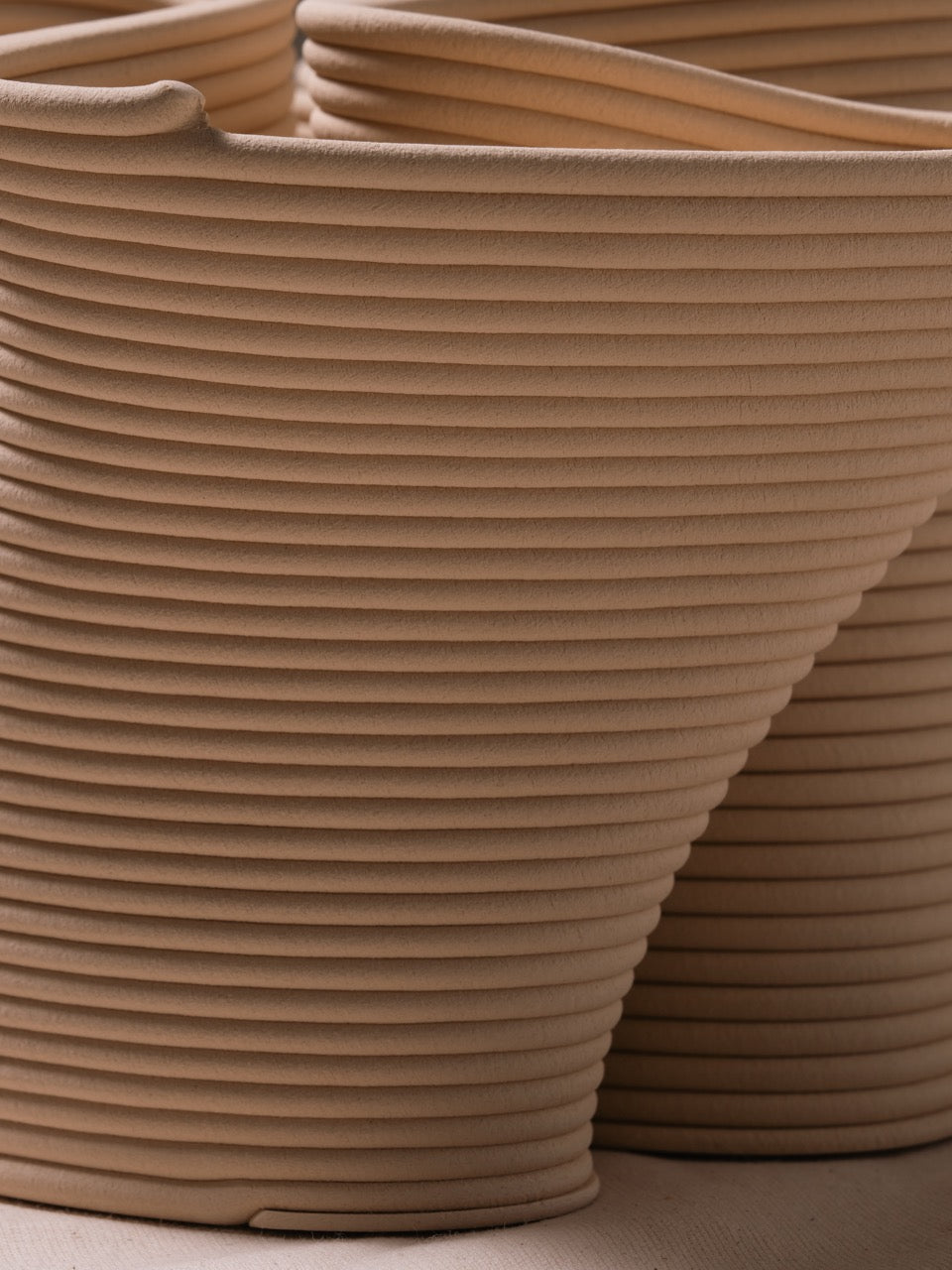 Coirra, dijital sarmal üretim tekniği ile mercanların doğal oluşum sürecinin kesişim noktasını araştırır. Her parça, mercanların kendi iskeletlerini yavaş bir birikimle inşa etmesine benzer şekilde, katman katman büyüyerek buruşuk bir form oluşturur. Kalın, sarmal yollar yüzeyde belirgin biçimde kalır ve üretim sürecinin izlerini taşır. Bazı yerlerde baskı yolları bilerek “kusurlu” tasarlanır; bu da sarmal dokuyu daha da belirginleştirir ve parçaların el yapımı tekniğe benzer bir şekilde inşa edildiğini vurgular.