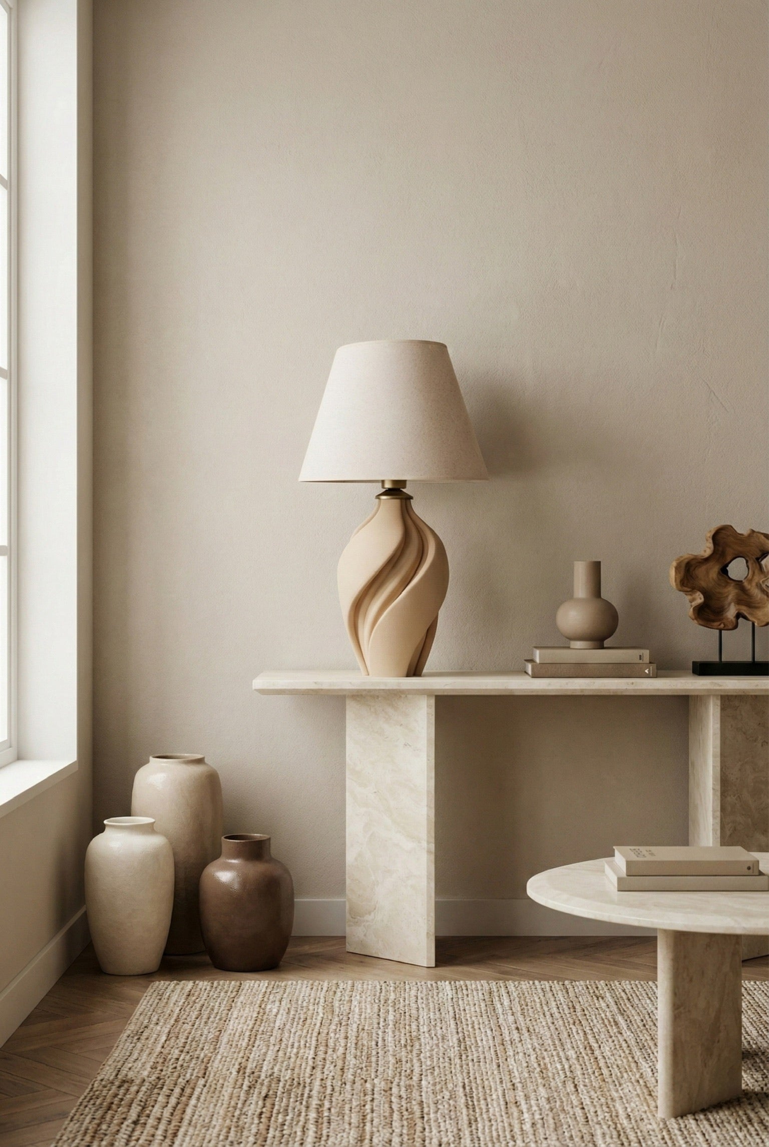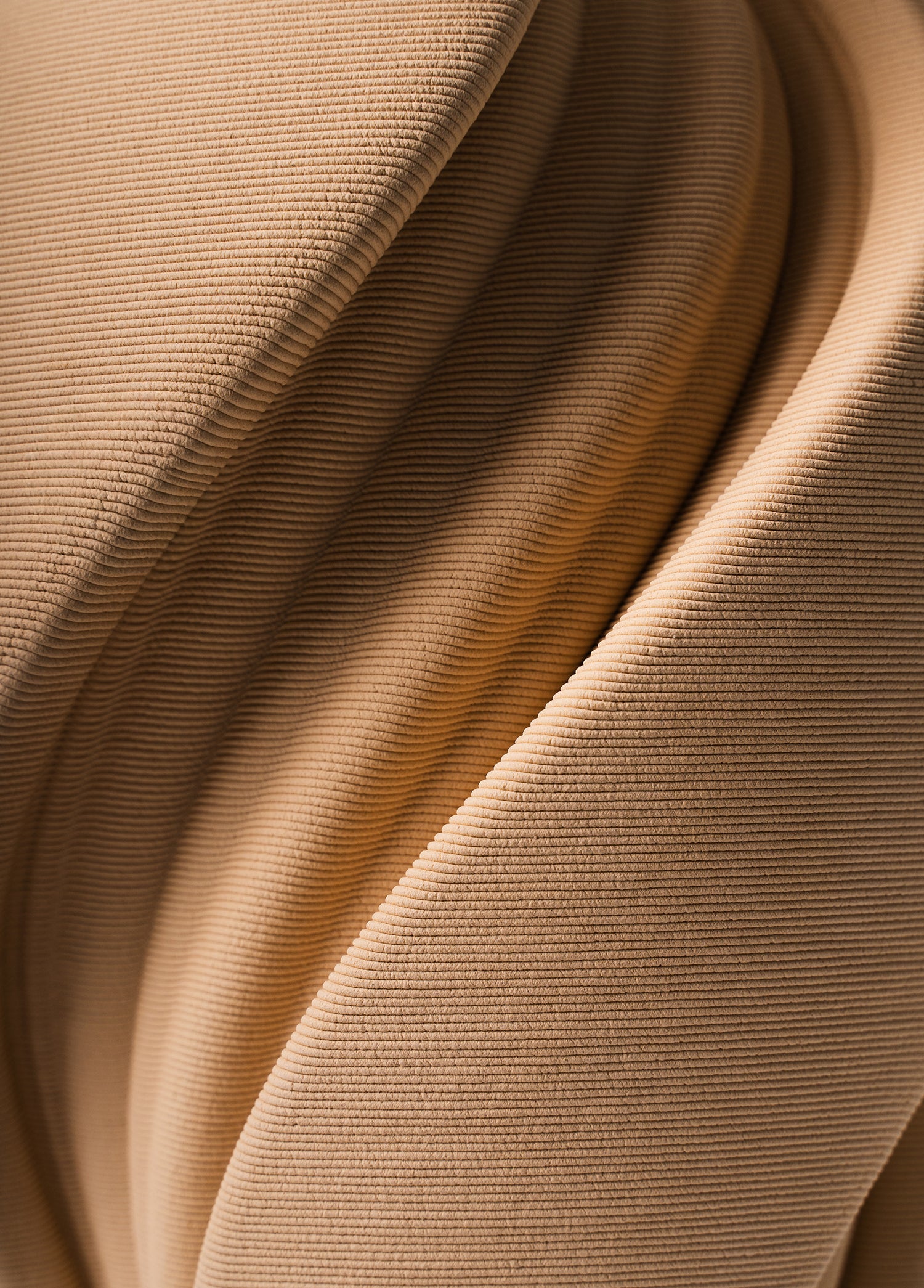 Bu tasarım, organik akışını ve dokulu yüzeyini vurgulayan dinamik bir gölge oyunu yaratır